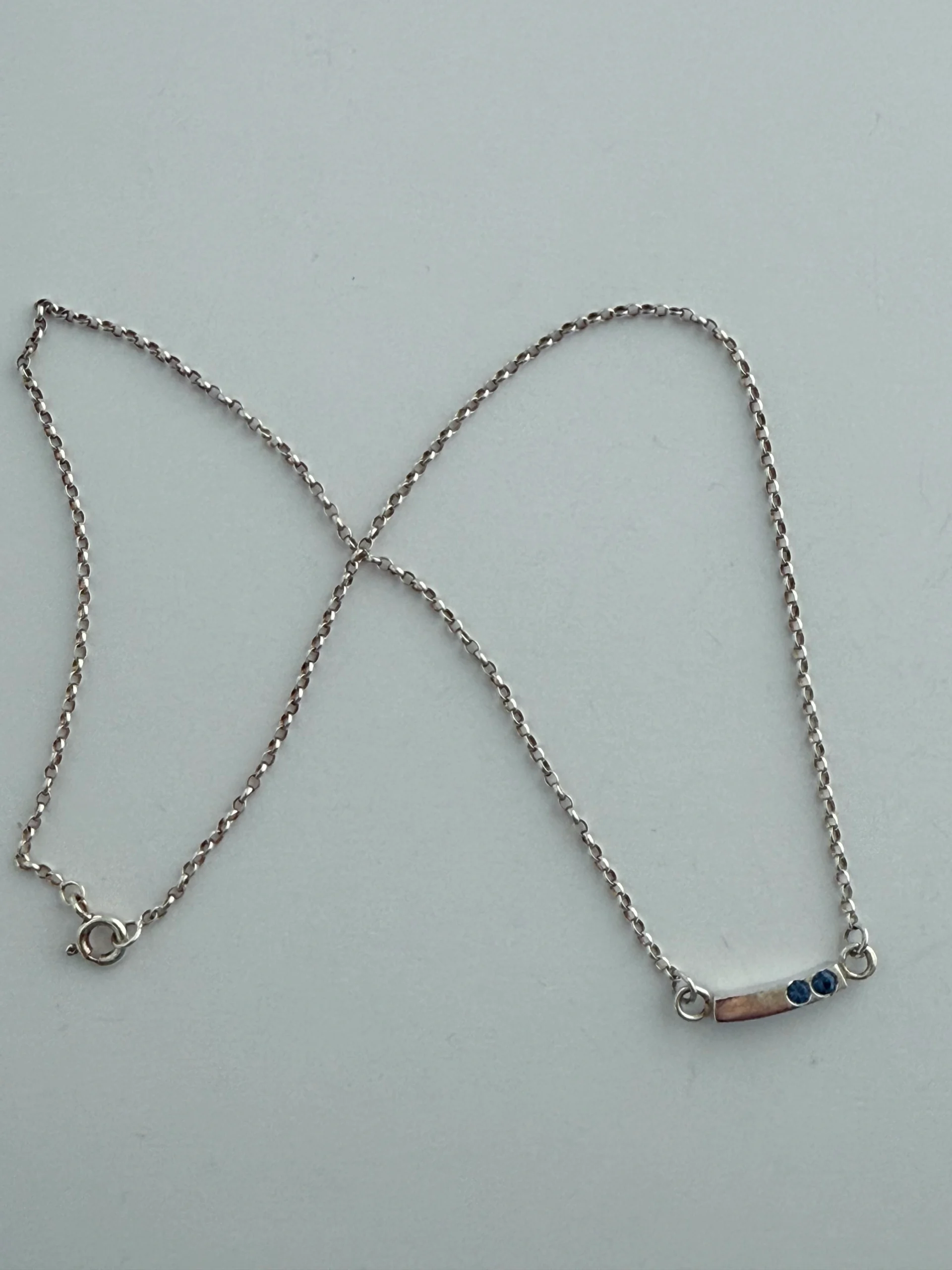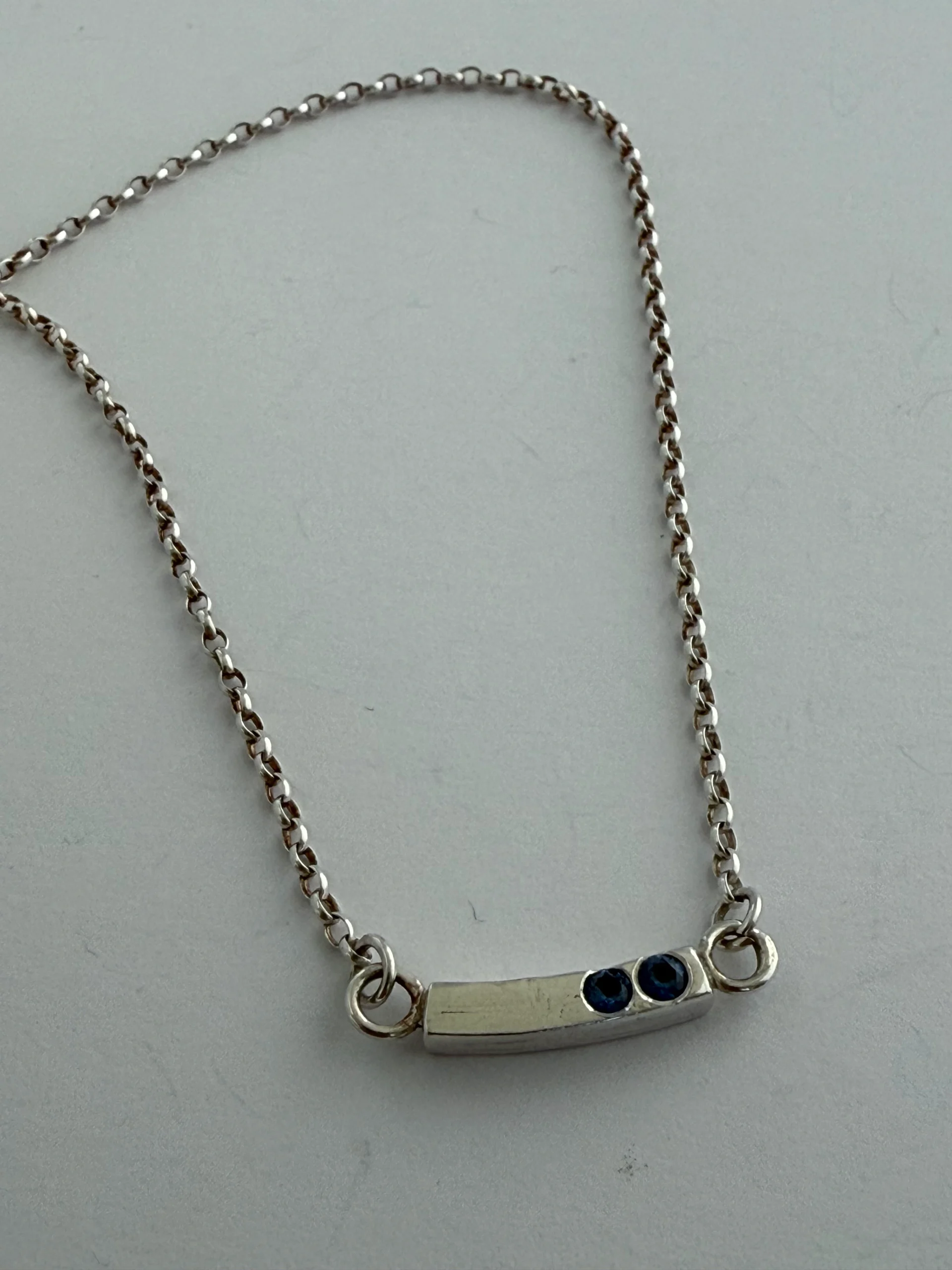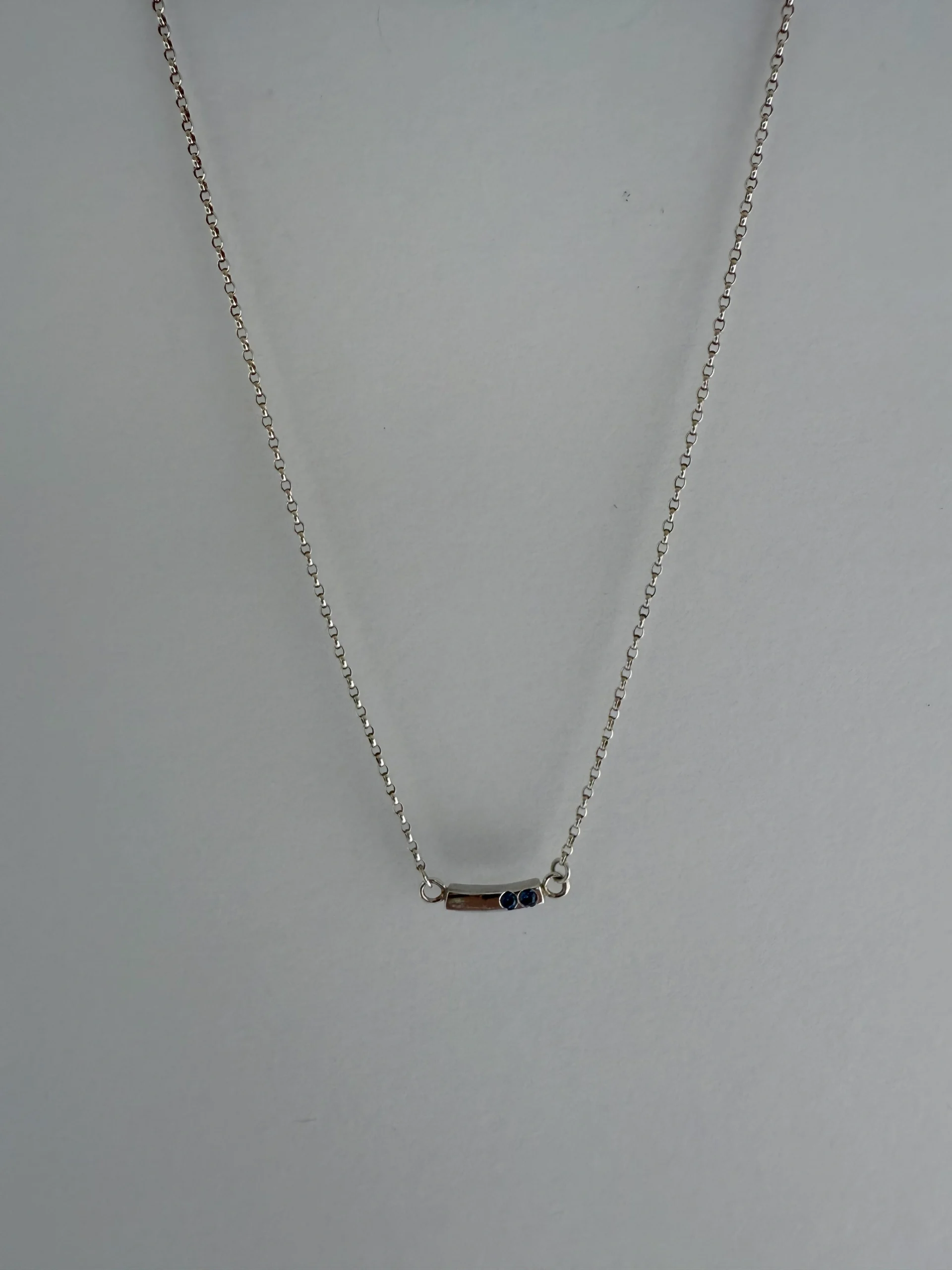A unique curved horizontal bar of sterling silver set with 2 blue swarorski crystals. The total length of the chain is 15 inch/39cm.