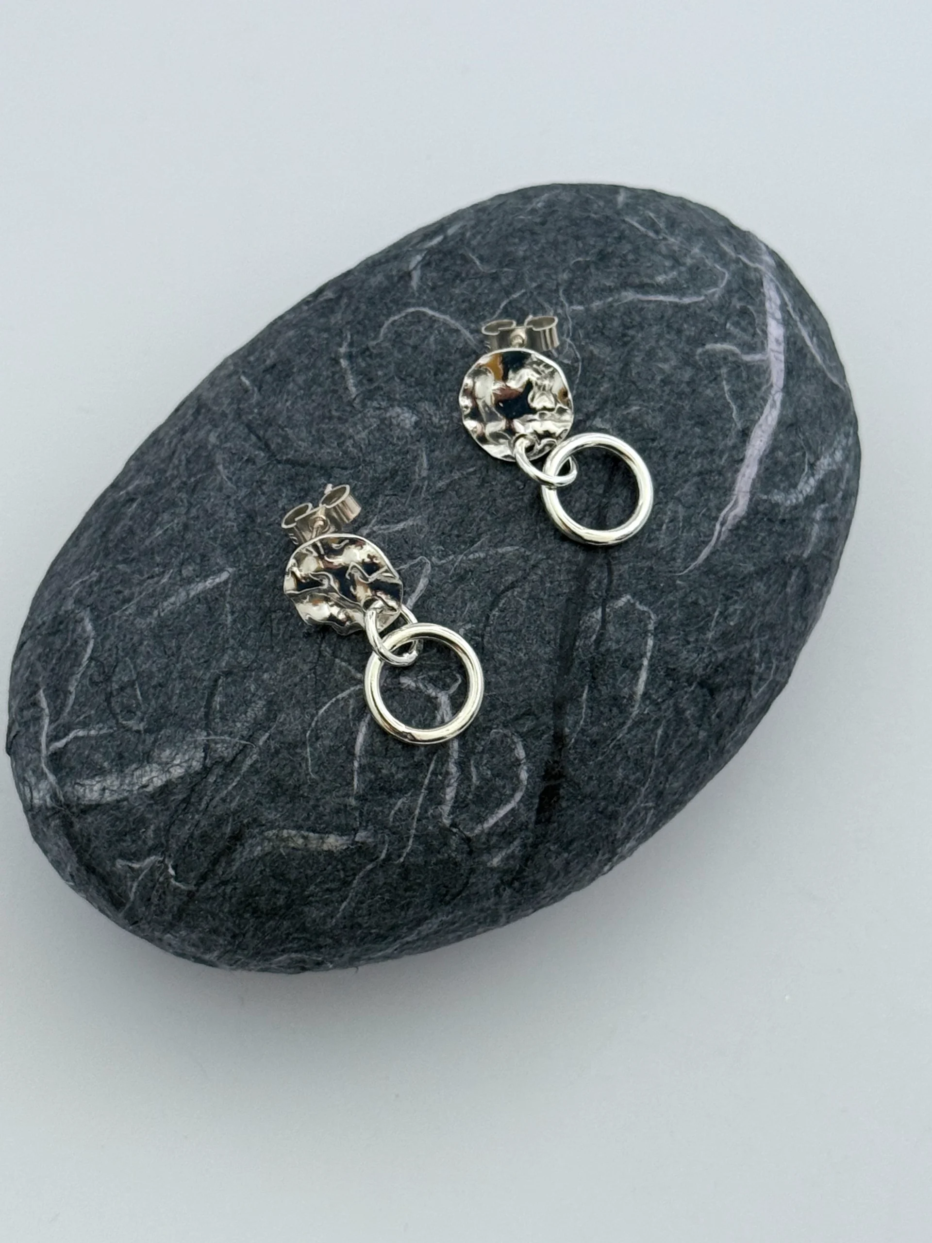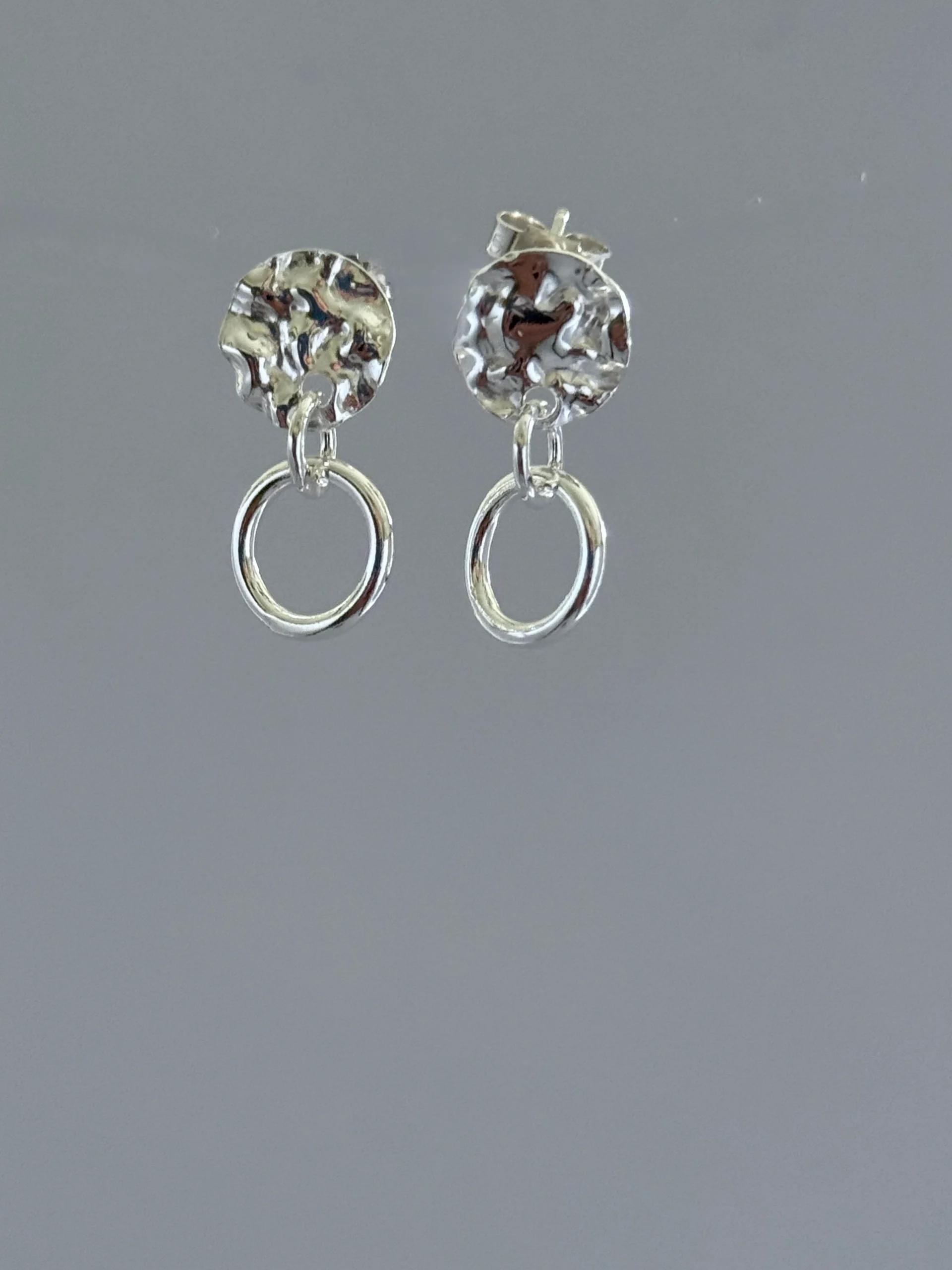 A favourite of mine these stud dangles catch the light and also have movement. A textured stud reflects the light while an open silver circle hangs below for movement. Each circle has a diameter of approximately 1cm and the total drop is approximately 2cm