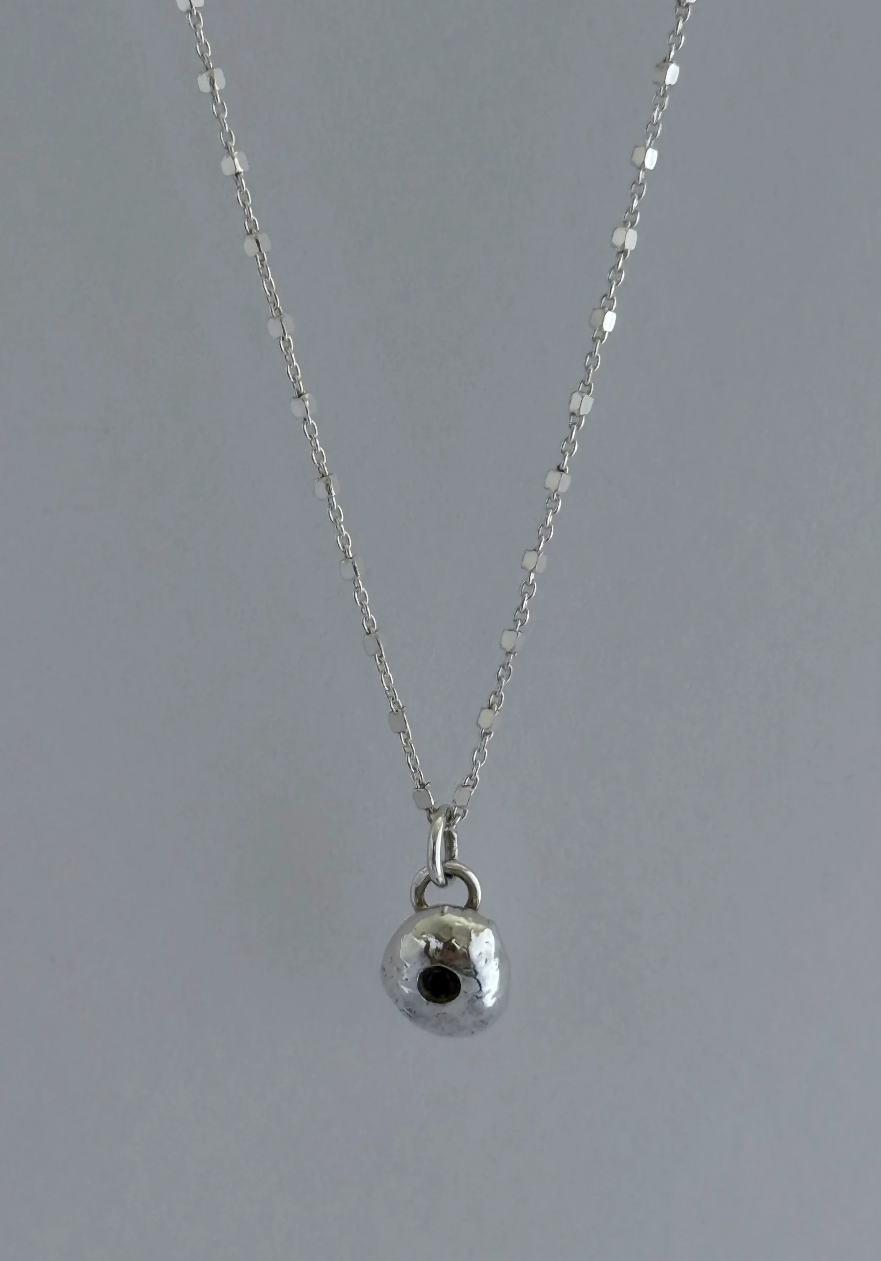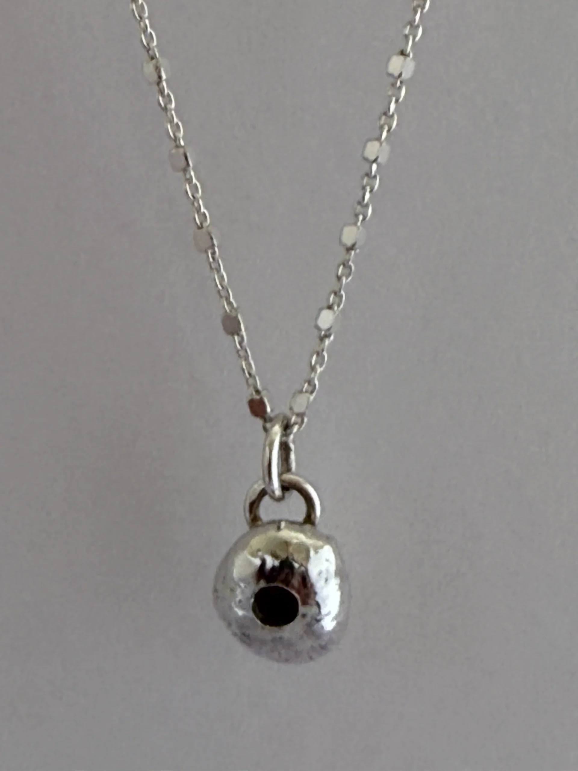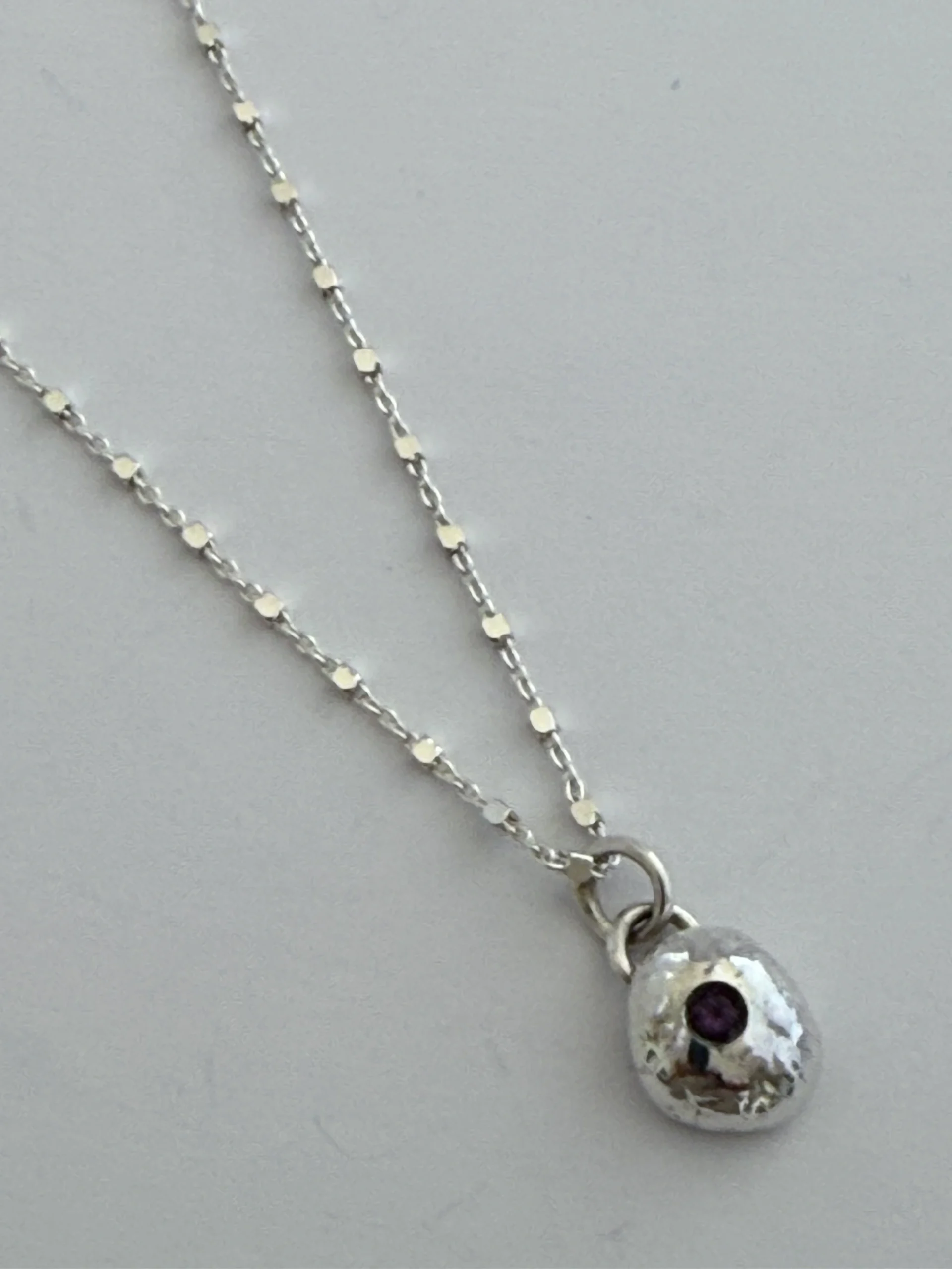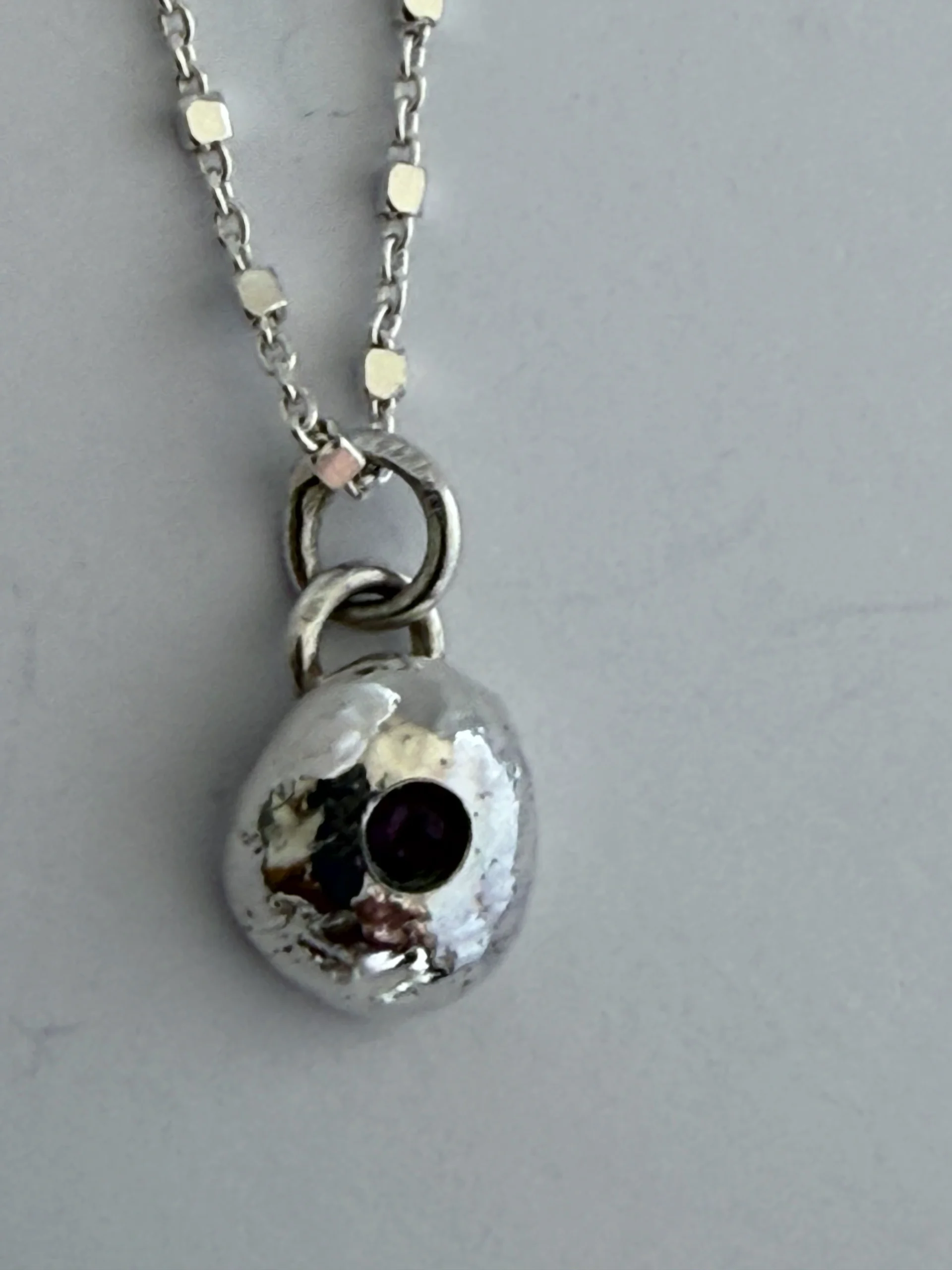 Nugget of recycled silver set with a tiny amethyst on a 16 inch chain