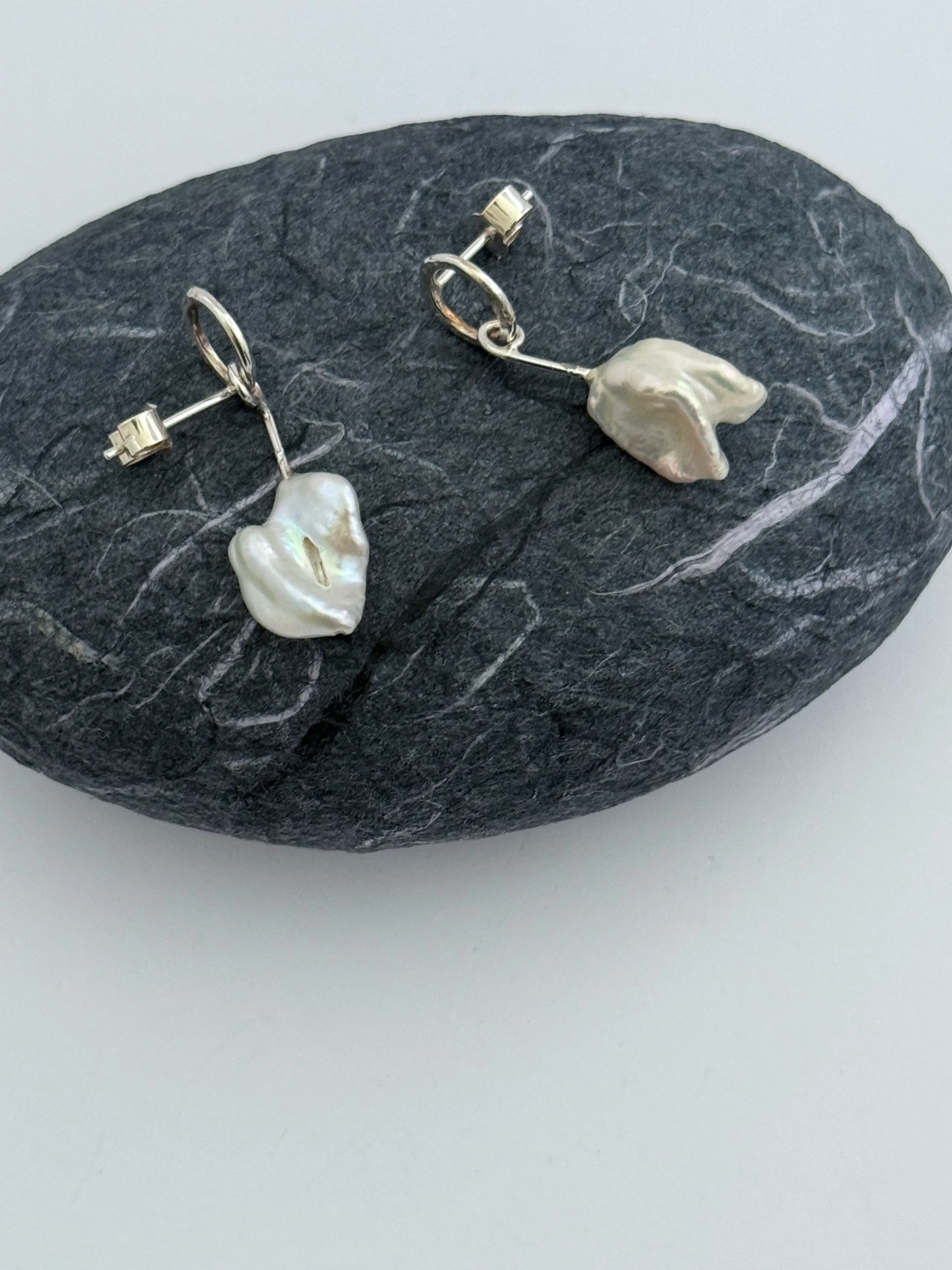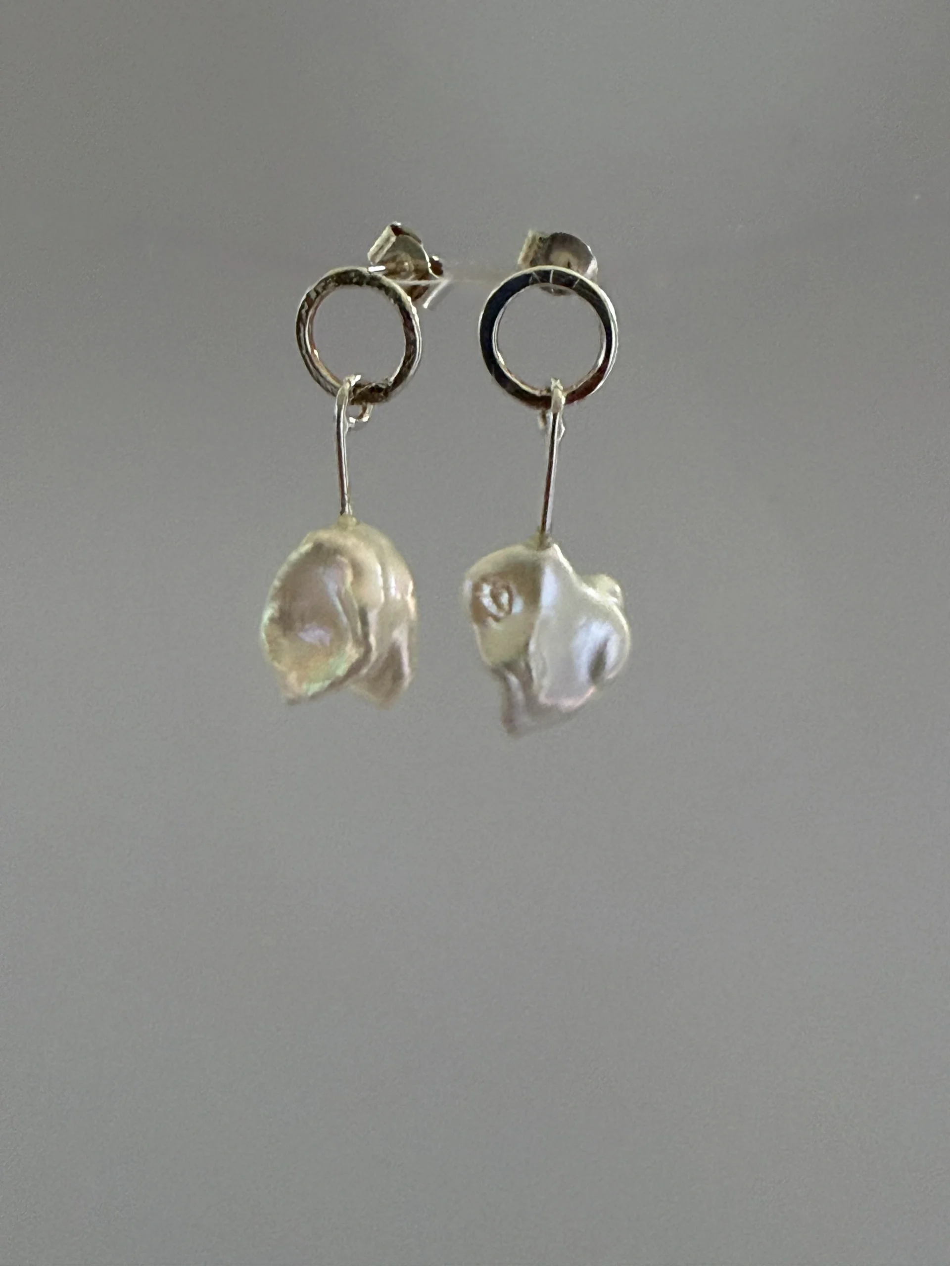 Keishi pearls are irregular and so pearls of a similar size have been selected for this design. The stud circle has a free moving dangle which is attached to the pearl. Each earrings is approximately 3cm in length.