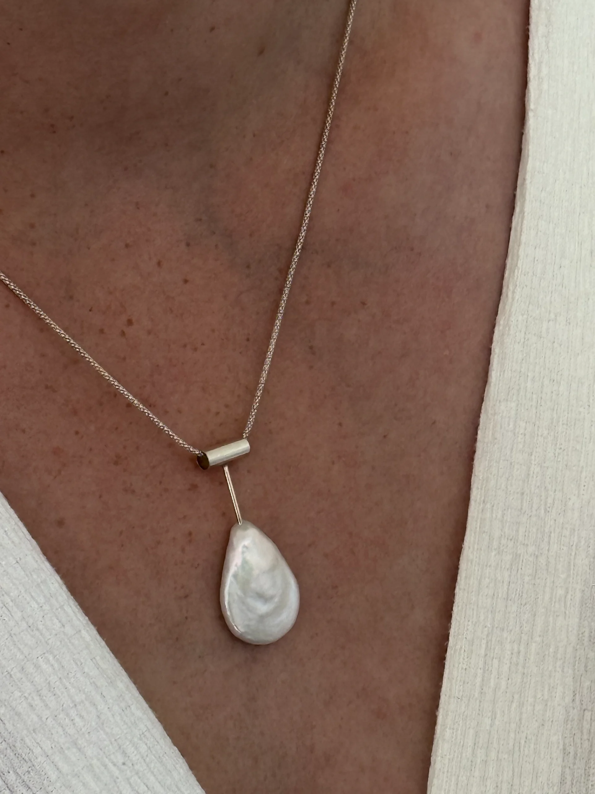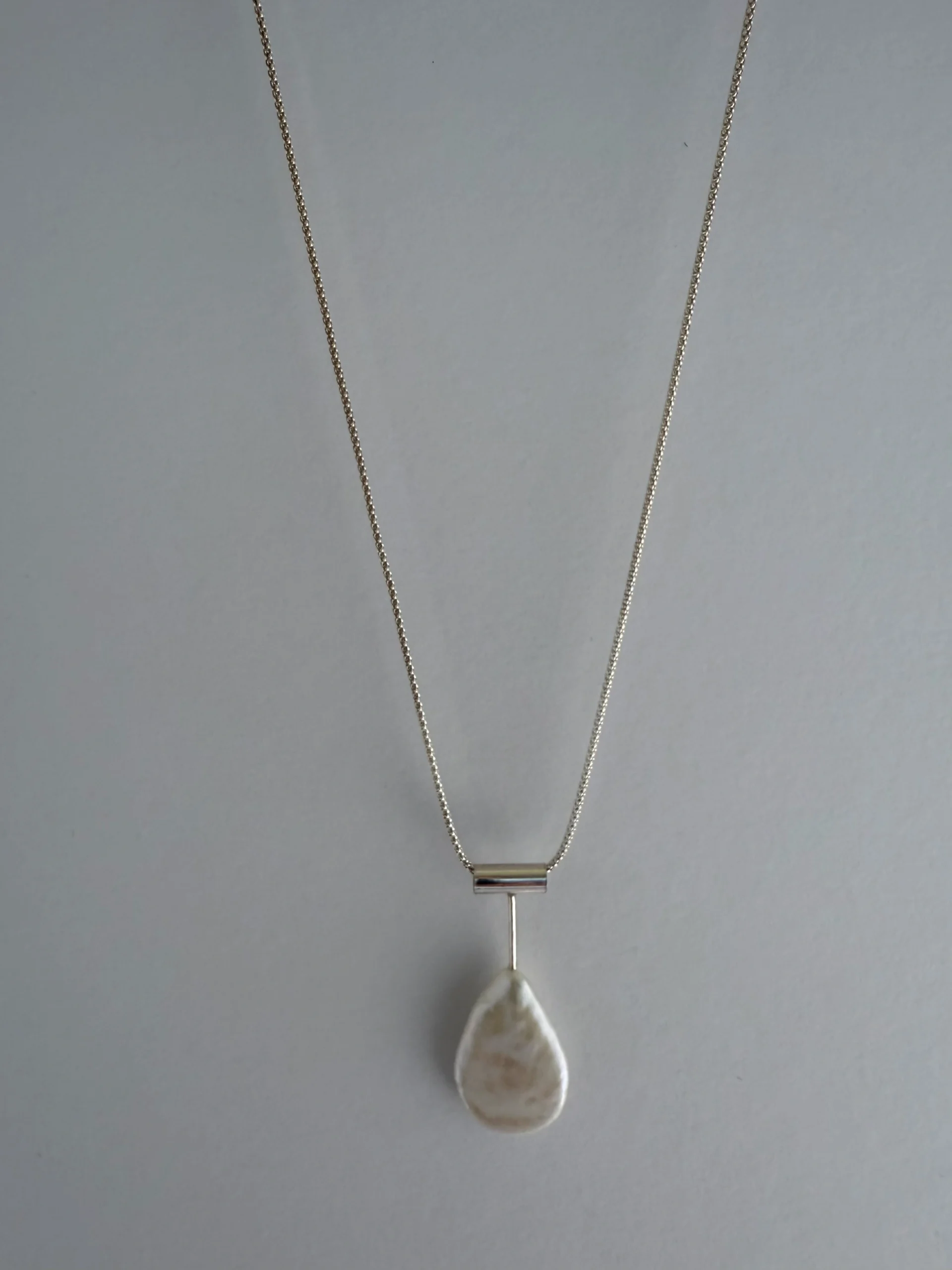 Freshwater ivory pear shaped pearl hanging from a 16 inch/41 cm popcorn style chain.