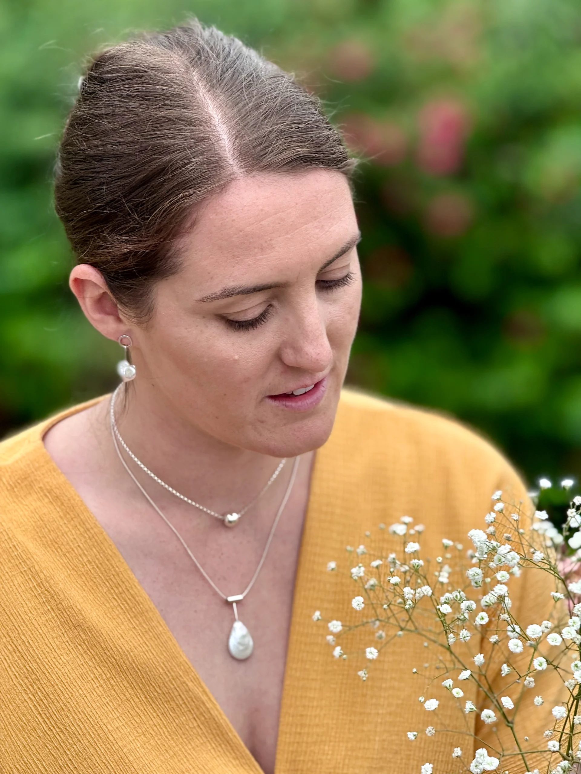 Freshwater ivory pear shaped pearl (drop including pearl is approx. 4cm in length) hanging from a 16 inch/41 cm popcorn style chain.