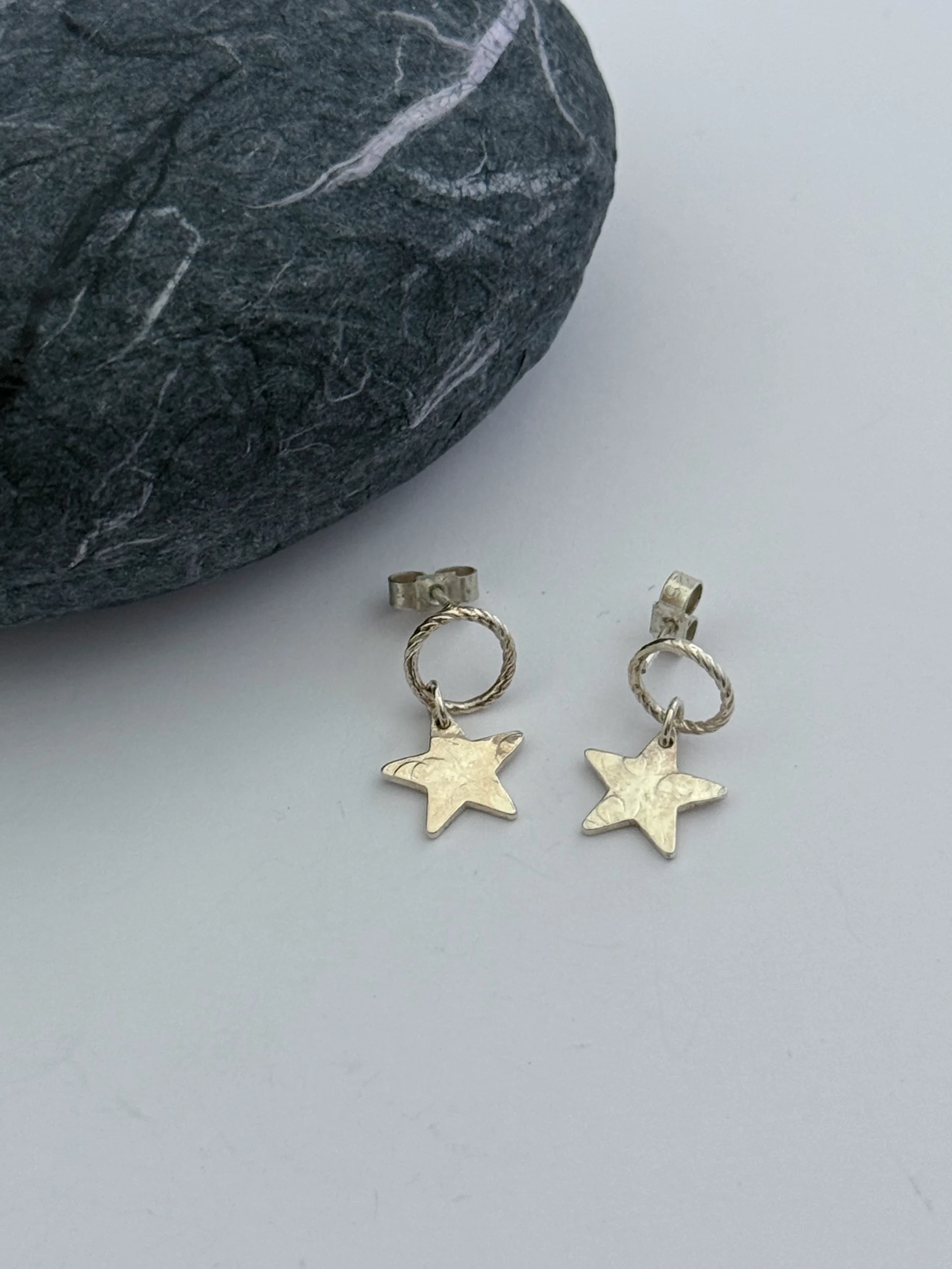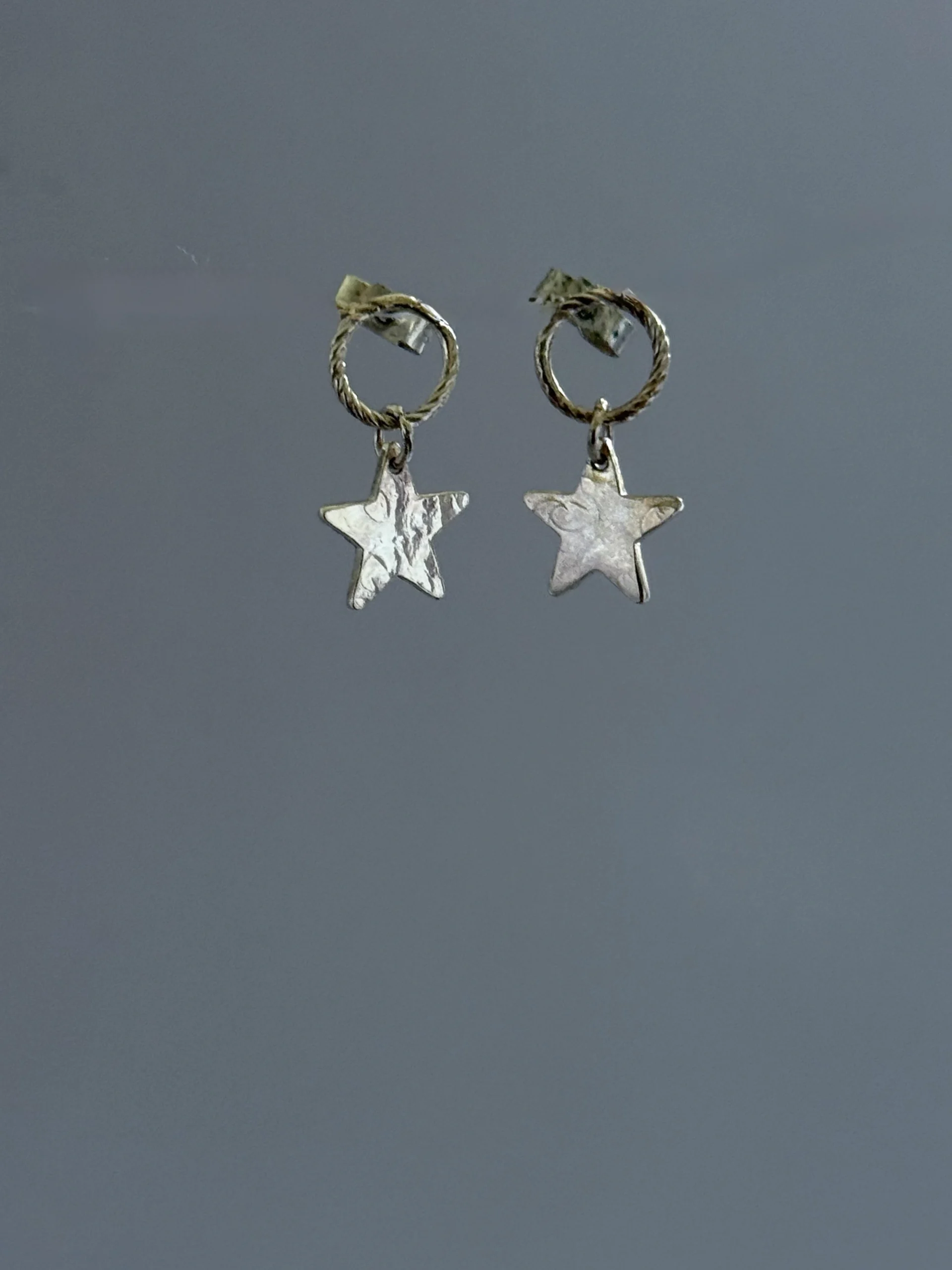A sparkly textured sterling silver star hangs from a twisted circle stud