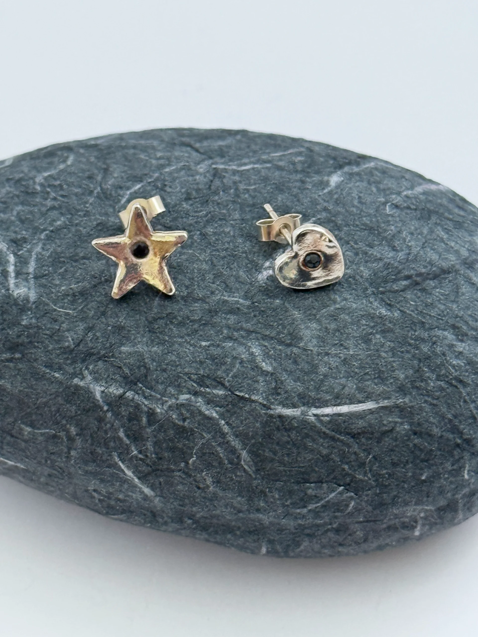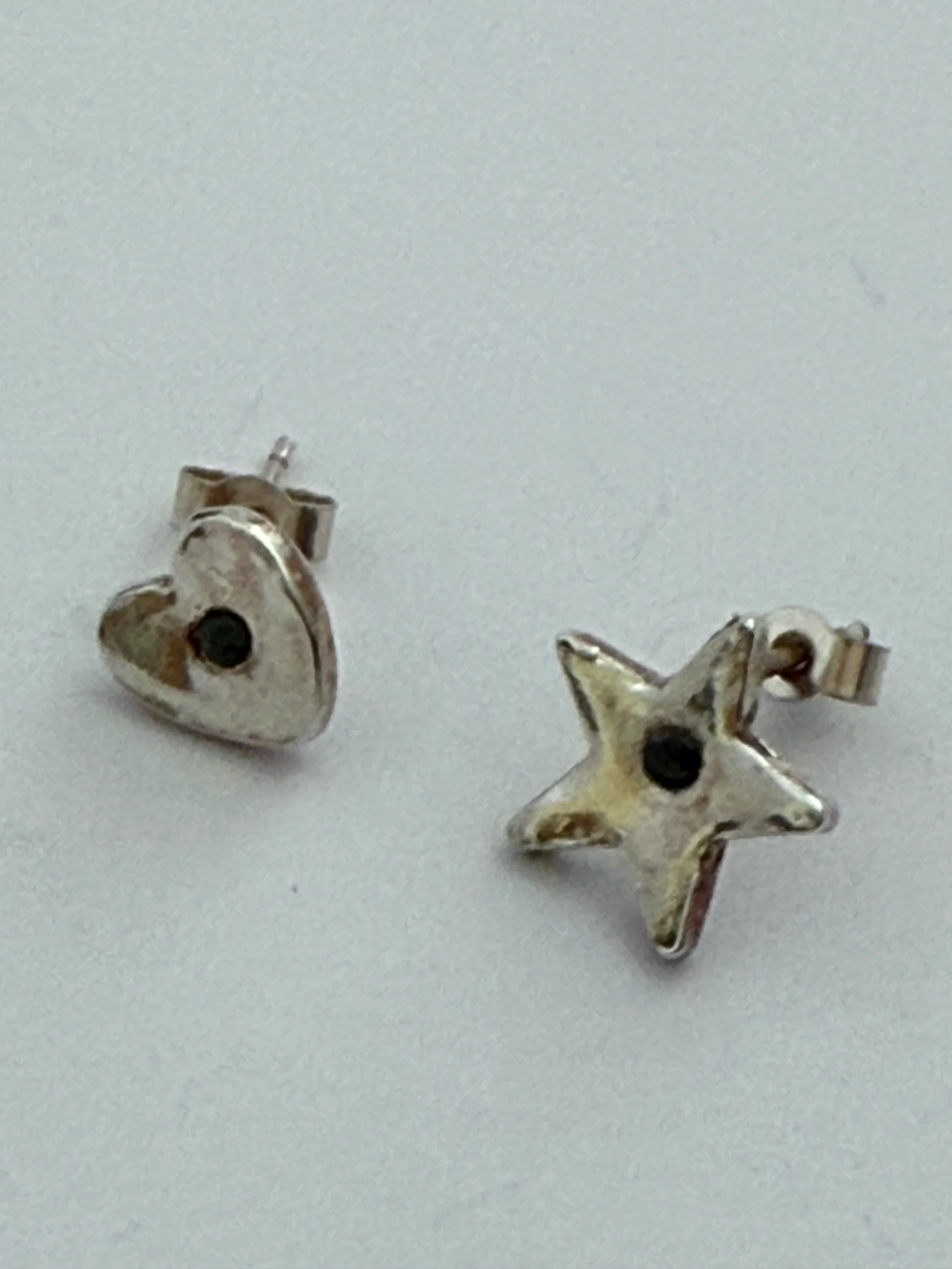 Small pretty studs – a fine silver heart and a star each centred with a small dark blue sapphire. Approximate size 1cm