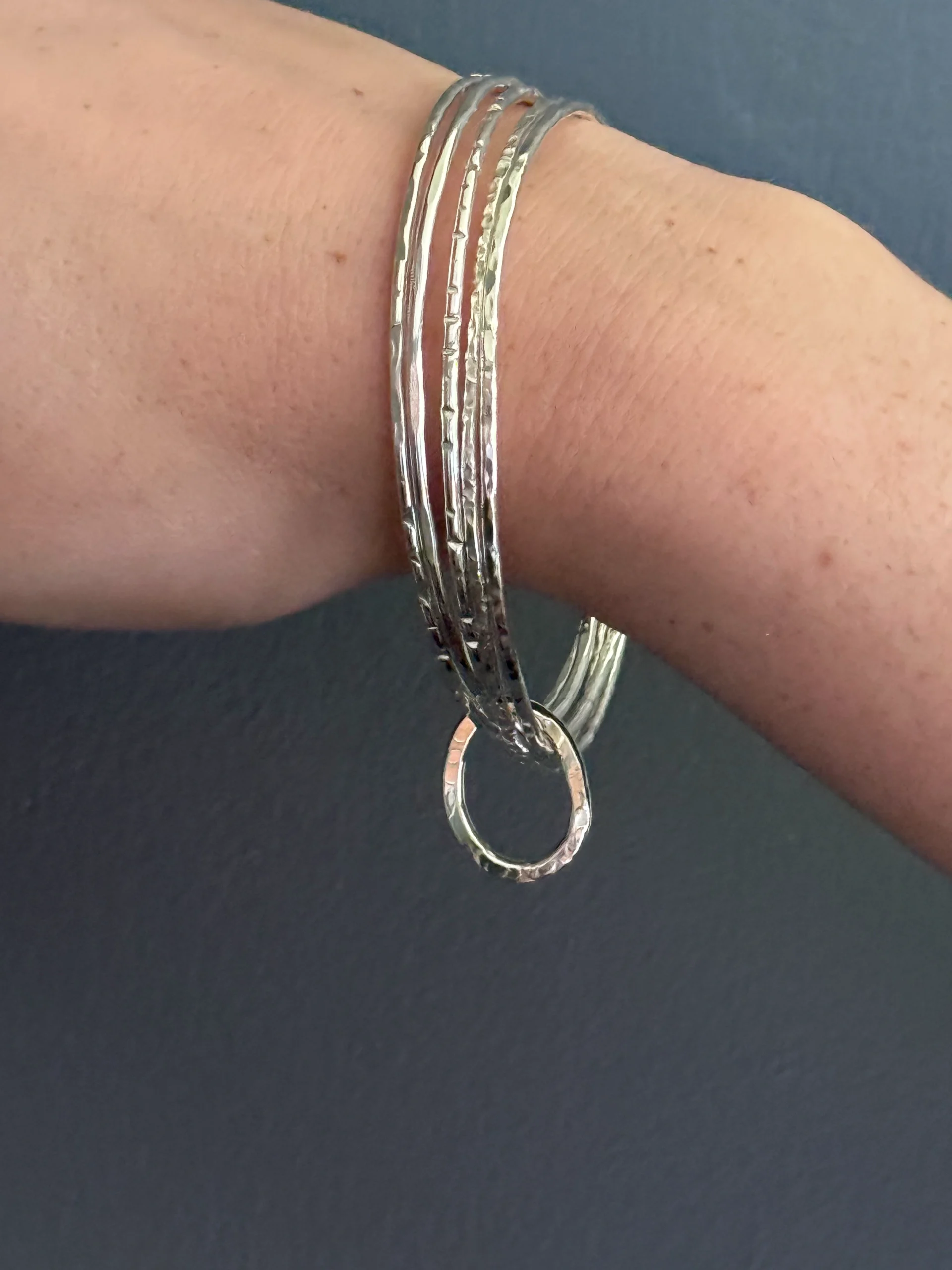 Steff is a heavyweight textured cuff and looks as good on girls as on men. This one has an internal diameter of 7cm so suits quite a large wrist. Can be made smaller. Hallmarked.
